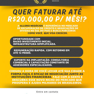 Alloro Negócios é uma empresa presente em todas as regiões do Brasil e atua como assessoria financeira, trabalhando como agente de negociação de dívidas bancárias, intermediando o conflito financeiro entre clientes e instituições financeiras. Com mais de 12 mil casos resolvidos com sucesso, garantimos no contrato a redução de, no mínimo, 50% do total da dívida, podendo chegar até 88% em determinados casos. O contrato também prevê o monitoramento e assessoria a toda a negociação, relativo aos serviços contratados.